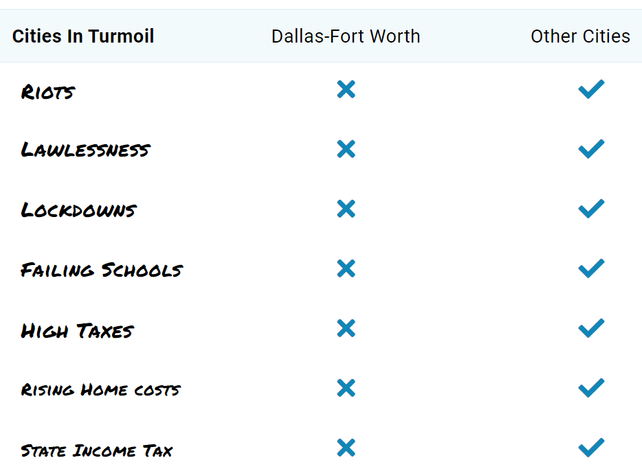 People are moving out of Portland, Oregon, Chicago, Illinois, Seattle, Washington, Los Angeles, California, Minneapolis – St. Paul, Minnesota, New York, New York, and many other areas and relocating to the Dallas-Fort Worth area because of poorly run governments leaving some cities and towns defenseless.